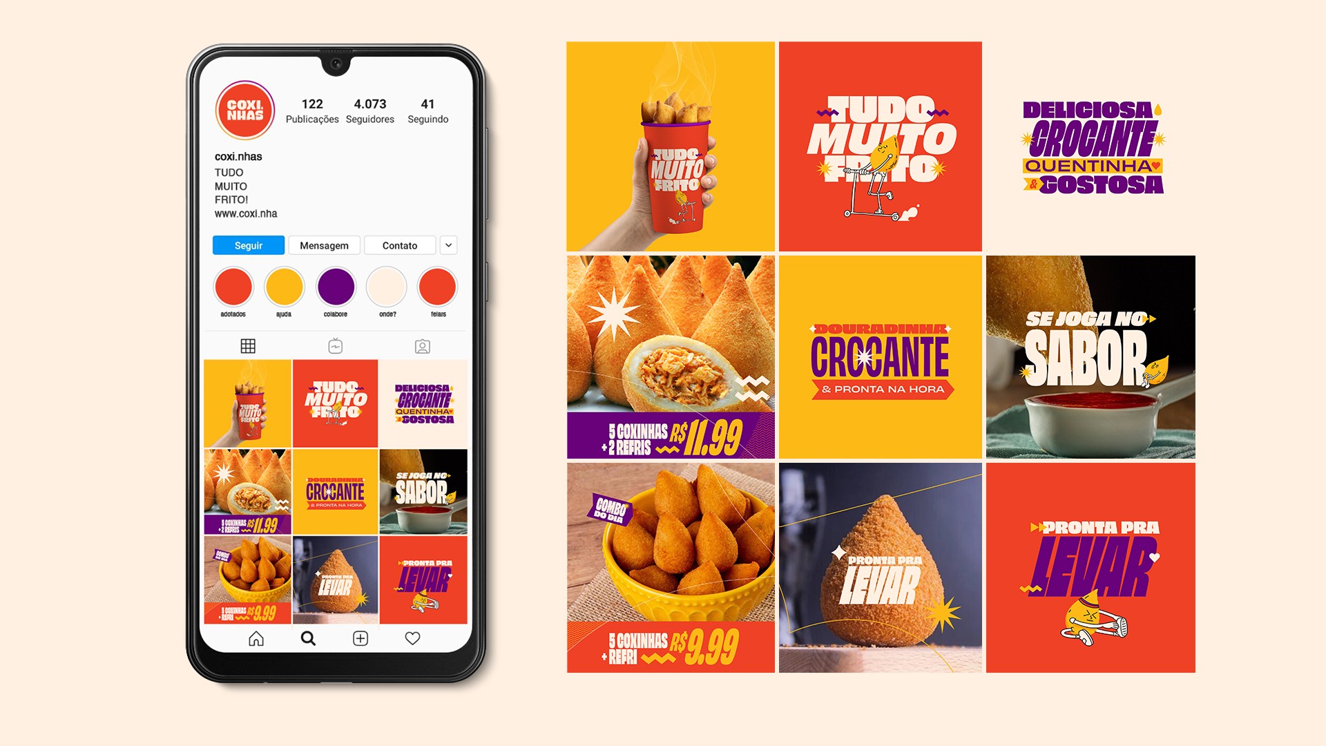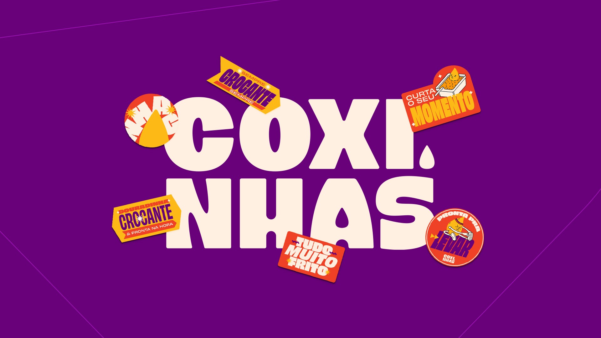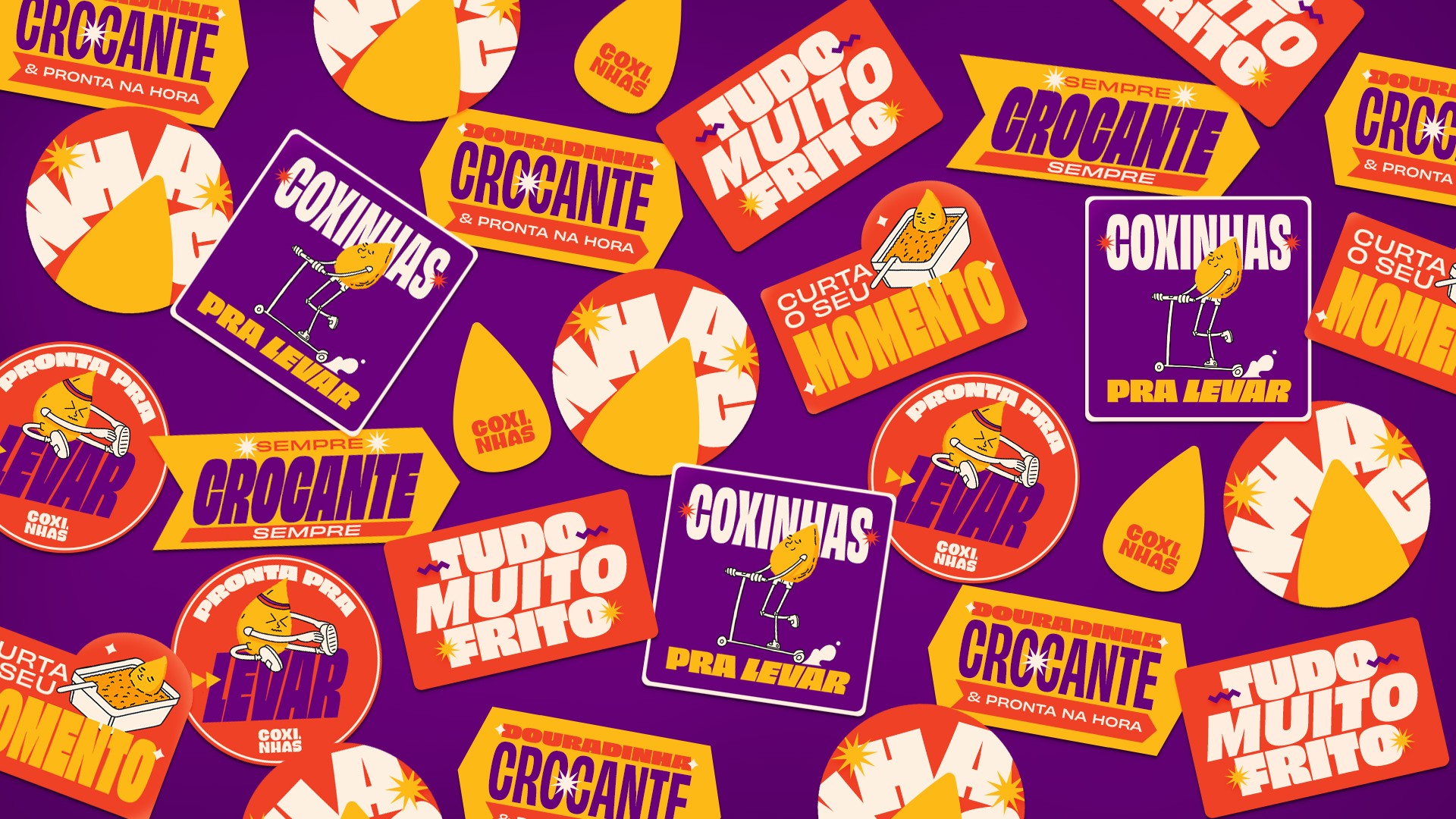 A project that brings together a combination of things we love: graphic design, illustration, typography, and delicious food. Coxinhas brings together a series of fun characters in an environment full of colors and graphics. We created a visual identity that follows the brand's dynamics: practical, delicious, and can be enjoyed everywhere.