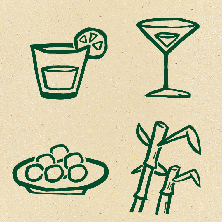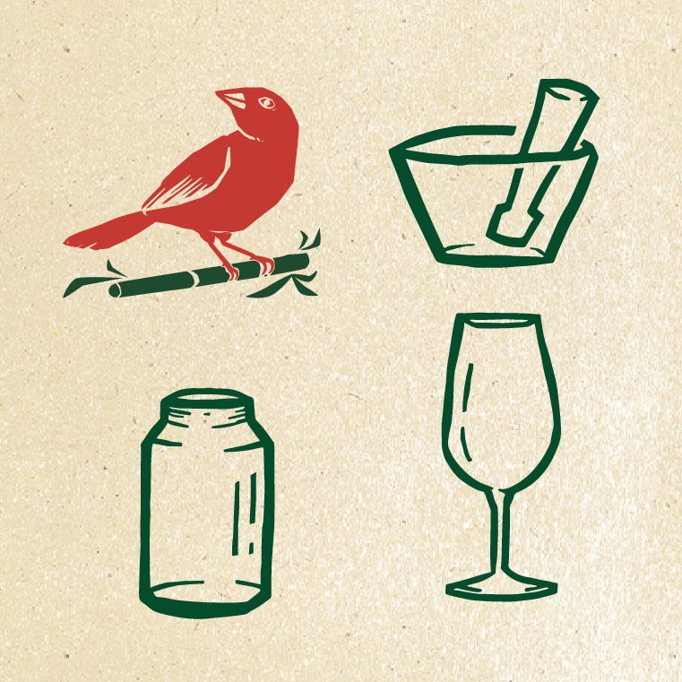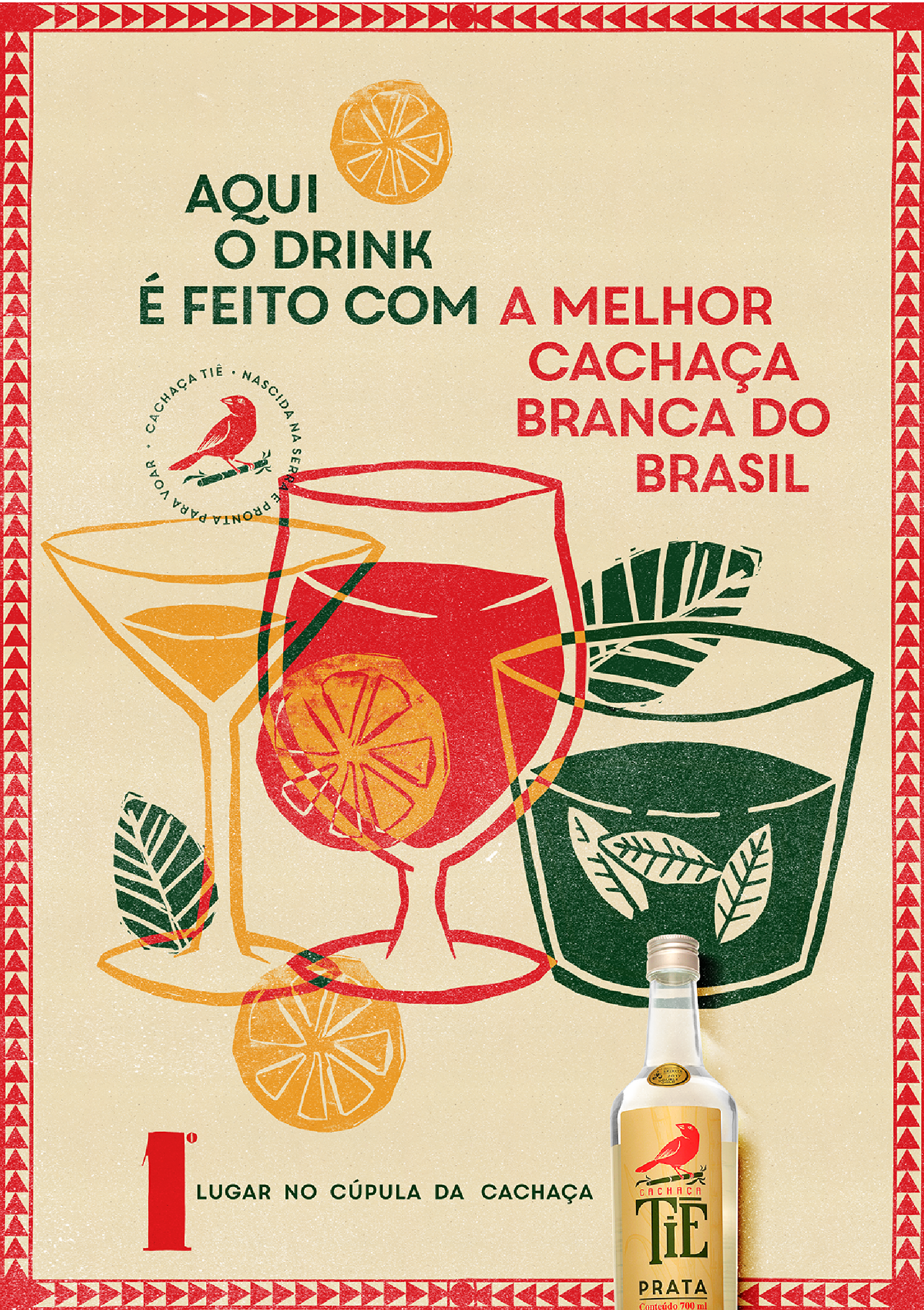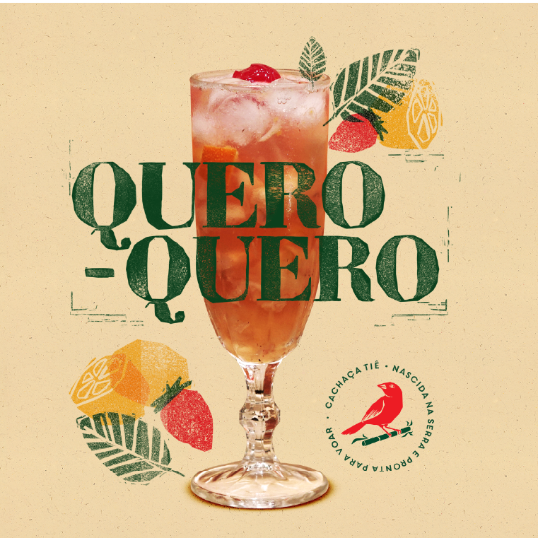 One of the brand's objectives is to disseminate the culture of genuine Brazilian artisanal cachaça production, an idea that we sought to illustrate in the project through rustic designs inspired by woodcut and Brazilian vernacular elements. This inspiration was the guiding thread of our entire creation, from the logo, where we stylized the bird that gives the drink its name, to the applications of illustrations in communication.
