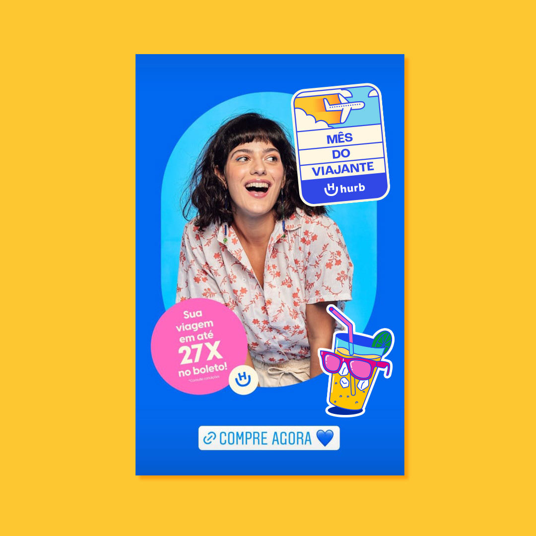 O Hurb é uma plataforma online que oferece serviços de busca e venda de passagens aéreas, diárias em hotéis e pacotes de viagens para diversos destinos. E para celebrar o mês do viajante, eles nos chamaram para criar uma campanha promocional com ilustrações, stickers e types com elementos que fazem parte do universo de quem adora viajar.