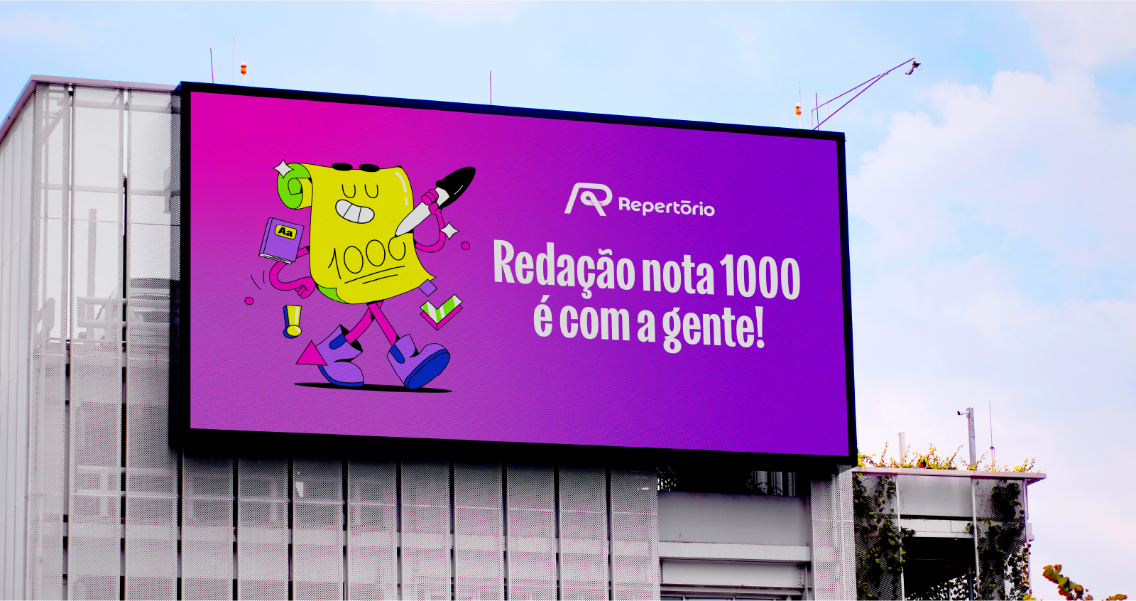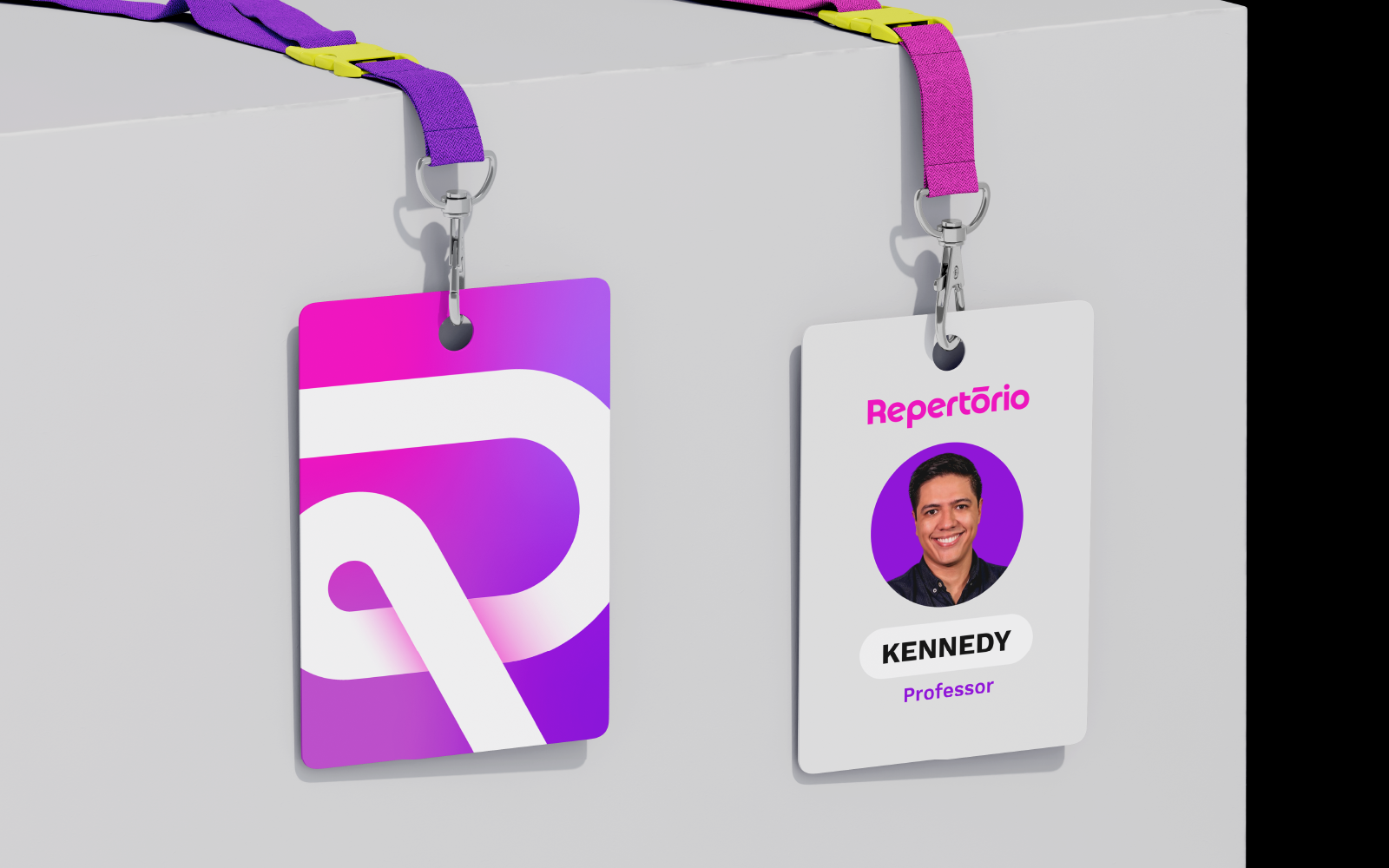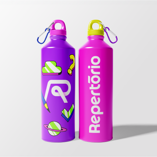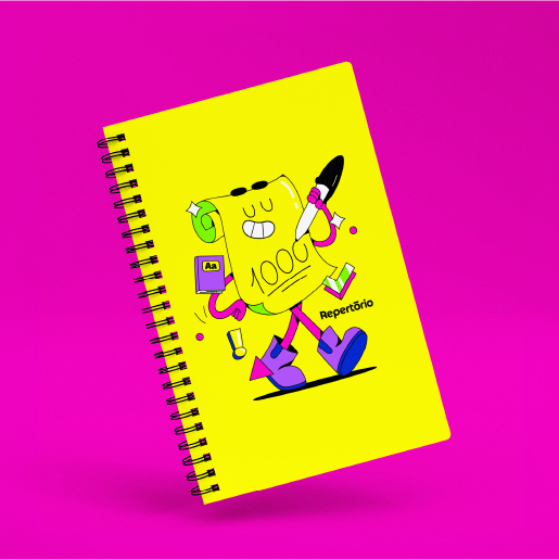 Desenvolvemos uma identidade rica em elementos inspirados no universo educacional tradicional, mas atualizados para o contexto digital. As cores principais, com destaque para o roxo em gradiente, remetem à tecnologia e dinamismo, reforçando o caráter inovador do Repertório.