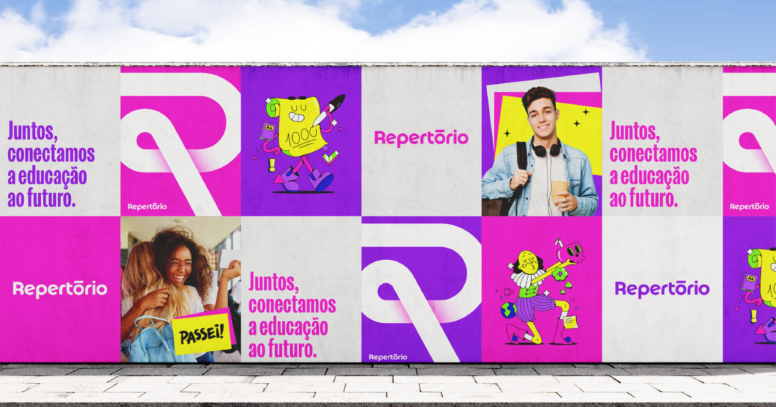 Trabalhando em conjunto com o cliente, identificamos quatro atributos fundamentais da marca: Juntos, Transformação, Upgrade e Conhecimento. Esses pilares sustentam tanto a identidade visual quanto o posicionamento da empresa no mercado educacional. O slogan criado, "Juntos transformamos o futuro da educação", evidencia essa missão e reforça o propósito do Repertório.