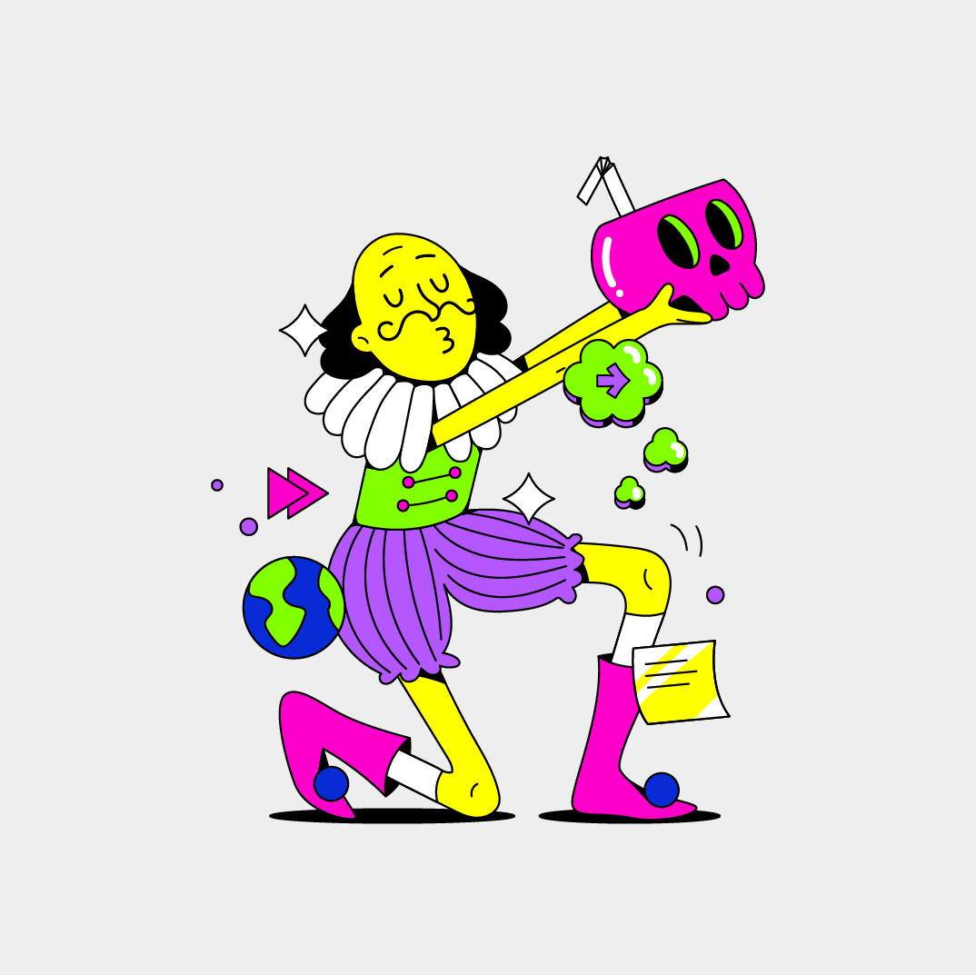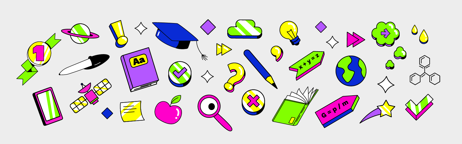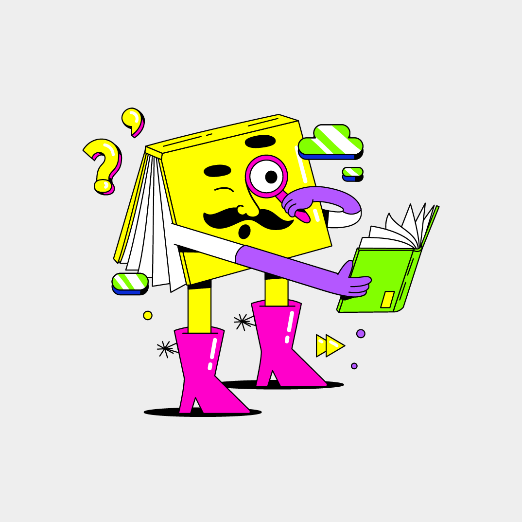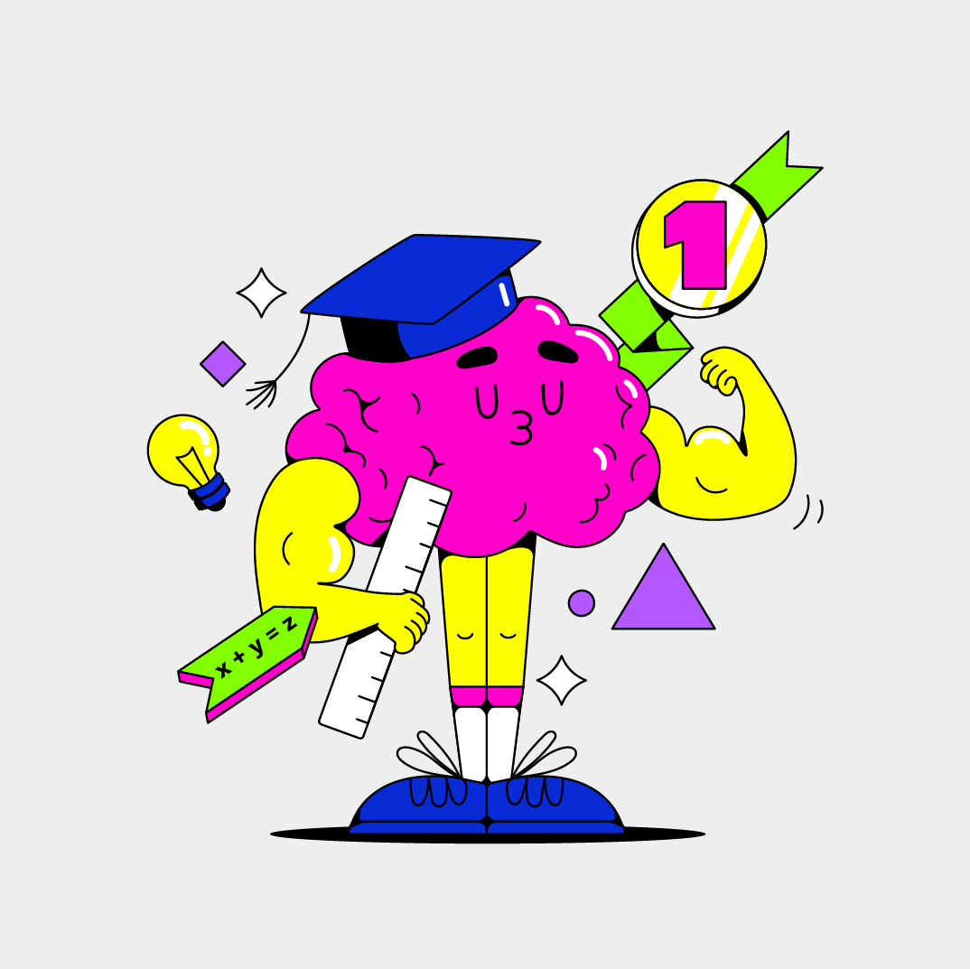As ilustrações apresentam analogias escolares e personagens repletos de elementos periféricos. Com uma estética contemporânea e rica em detalhes, essas ilustrações dialogam diretamente com os layouts e demais elementos visuais, equilibrando bom humor e tons que refletem a conexão com a educação, evolução e futuro.