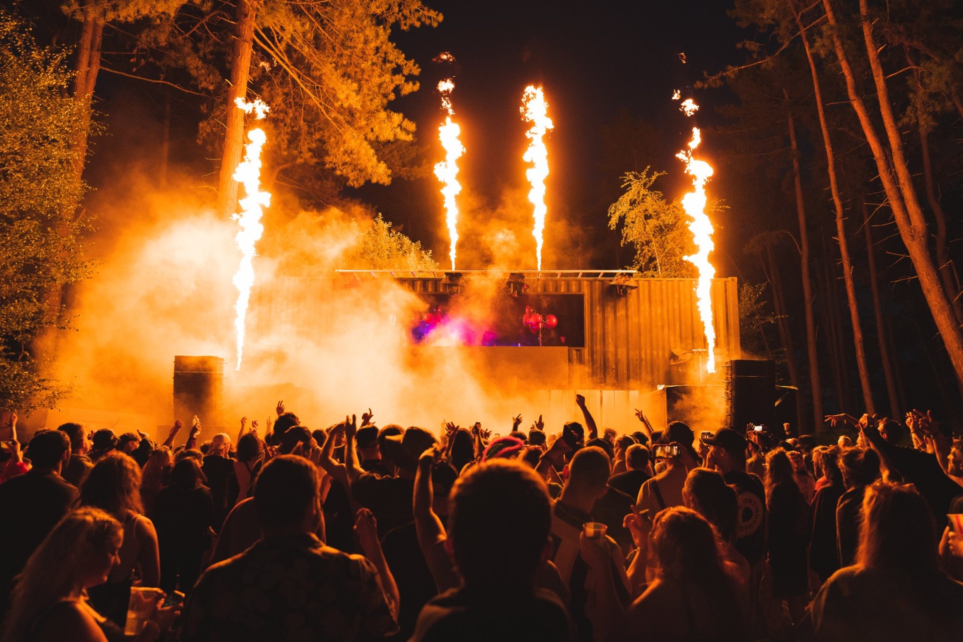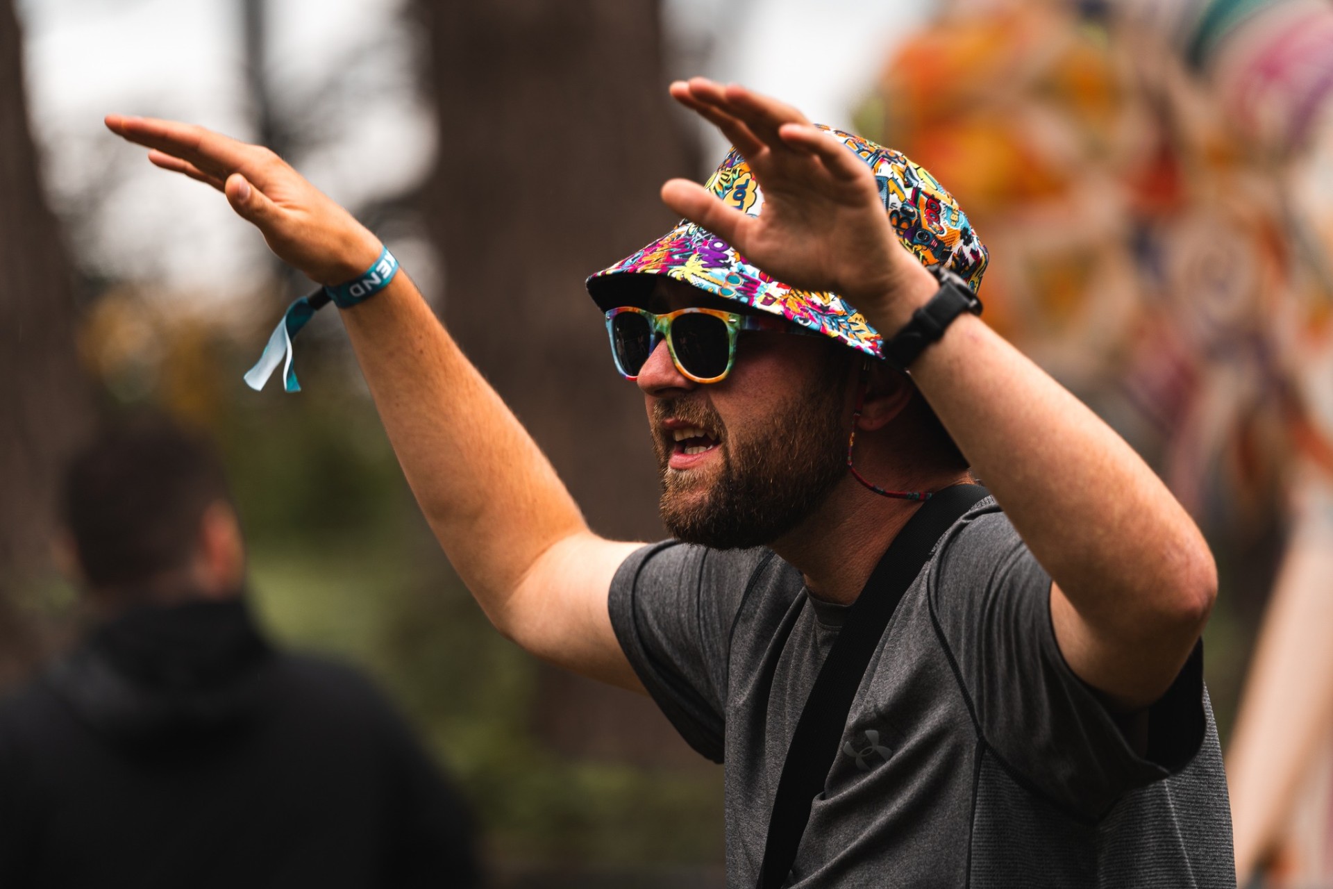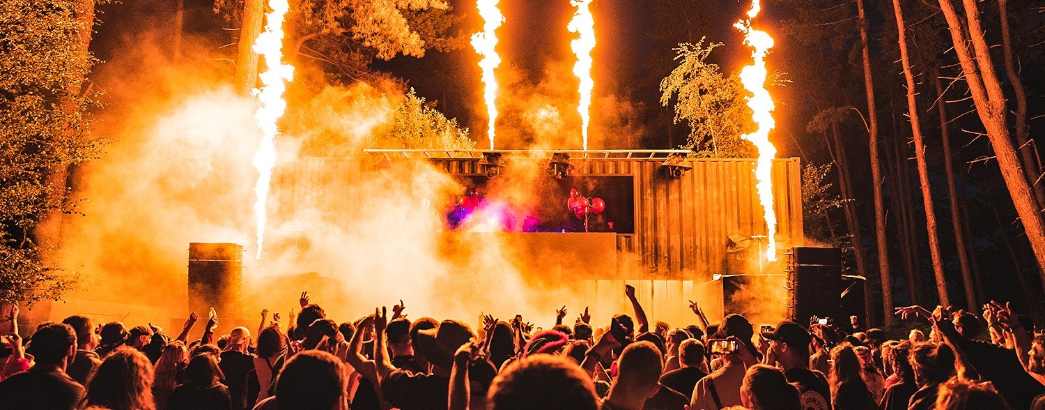 Criamos um visual com elementos e símbolos inspirados no universo da música eletrônica, como notas musicais, equalizadores, fones de ouvido, entre outros. Para dar um toque ainda mais descontraído e divertido, incluímos alguns elementos que fazem referência ao clima das raves. Esses elementos ajudam a criar uma atmosfera de celebração e energia. O uso dos animais também foi uma forma de conectar a arte com o festival, que acontece dentro de uma floresta.