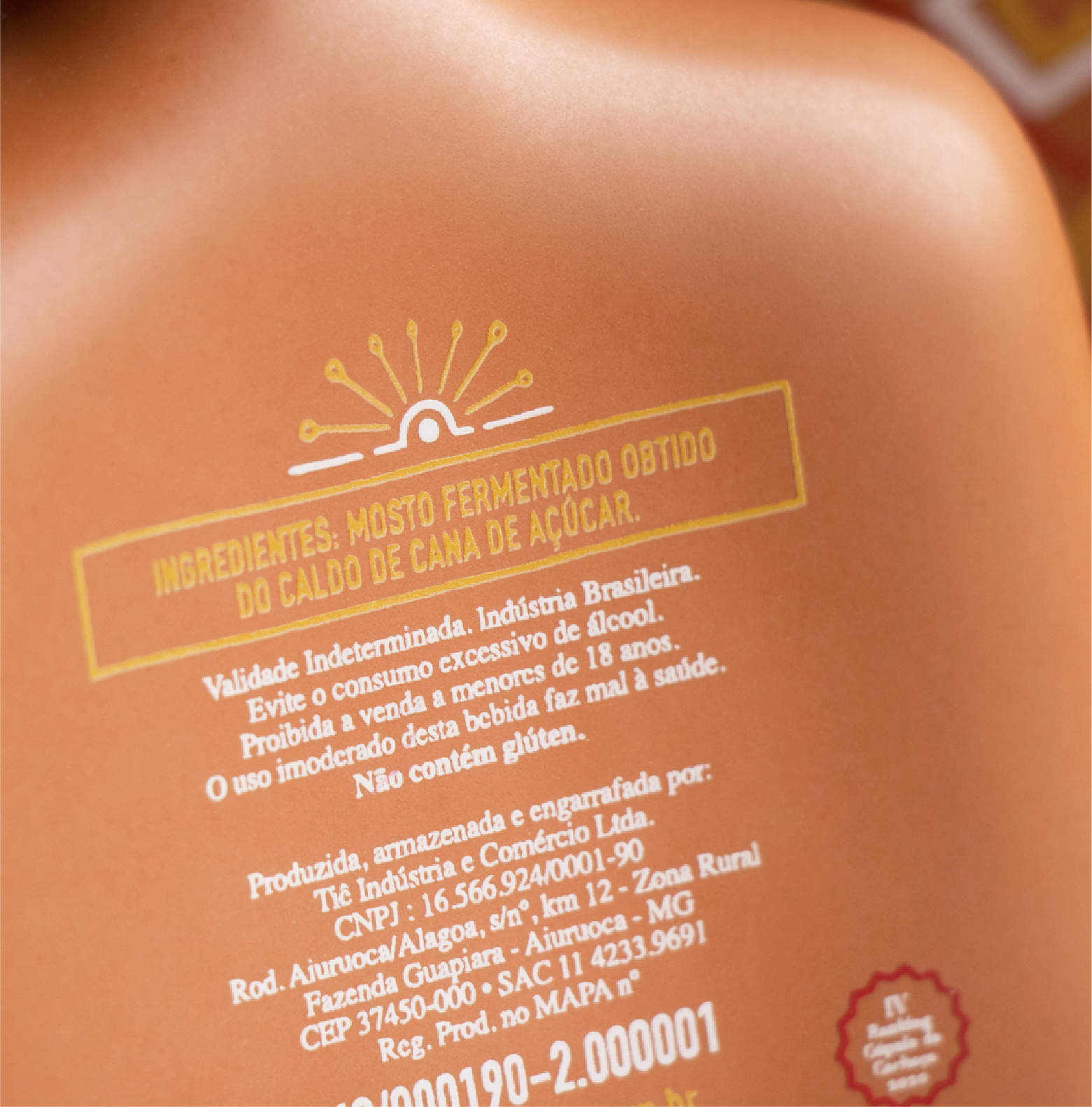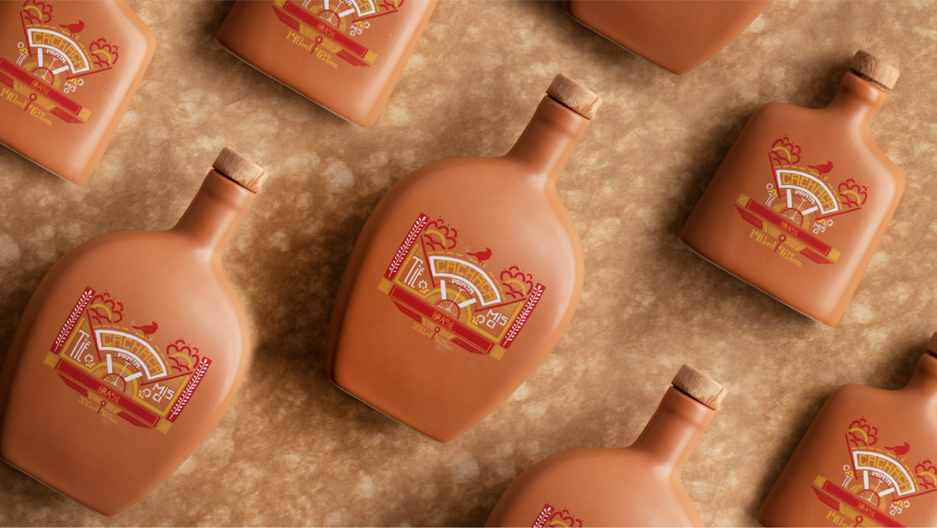 O rótulo foi impresso em serigrafia, técnica que ajuda a realçar as cores e o acabamento da arte. Como a arte remete à xilogravura, foi uma forma de aproximar as técnicas de impressão, com um acabamento ainda mais fino e artesanal. O barro da garrafa também é uma referência direta a produtos e mobílias clássicos das casas brasileiras, como o filtro de barro e a moringa.